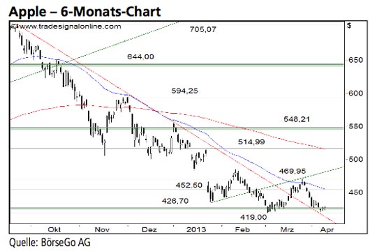 Das in der KeyInvest Daily Markets Analyse vom 21.02.2013 beschriebene Szenario einer Bodenbildung im Bereich der Unterstützung bei 426,70 USD ist damit weiter- hin möglich. Eine Entscheidung dürfte in Kürze fallen. Die Long-Szenarien: Können die Aktien sich in den kommenden Tagen von den Unterstützungen bei 419,00 und 426,70 USD nachhaltig nach oben lösen, lägen Kursziele bei den Wider ständen bei 452,50 und 469,95 USD. Letztere Marke dürfte im Anschluss über den weiteren mittelfristigen Verlauf des Titels entscheiden. Wird sie überwunden, wäre ein bullisher Doppelboden vollendet, der ähnlich dem Dreifachboden im Jahr 2009 die Basis für einen neuen Aufwärtstrend darstellen könnte. Das nächste Ziel wäre in diesem Fall bei 514,99 USD, einem Zwischenhoch aus dem Januar, anzusiedeln. Die Short- Szenarien: Ein nachhaltiges Unterschreiten der Unterstützung bei 419,00 USD wäre hingegen negativ zu werten. Die Aktien dürften in diesem Fall ihre Abwärtsbewegung wiederaufnehmen und bis 364,90 und darunter auf 355,00 USD ausverkauft werden. Dieser Kursbereich könnte als langfristige Unterstützung dienen und eine Wende nach oben einleiten.