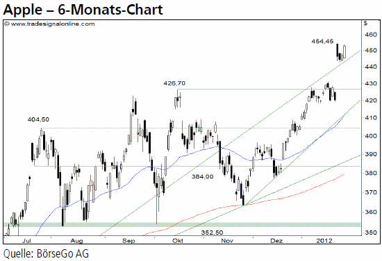 Ausblick: Die derzeitige Korrektur sollte den kurzfristigen Kursverlauf der Aktien von Apple bestimmen, ehe es zu einem weiteren Anstieg an das neue Rallyhoch kommen dürfte. Allerdings dürfte die Rekordmarke nicht ohne weiteres zu überwinden sein. Die Long-Szenarien: Der Wert könnte zunächst bis 435,00 - 440,00 USD korrigieren und dort zu einem weiteren Anstieg an 454,45 USD ansetzen. Auf diesem Niveau würden sich aus unserer Sicht erste Gewinnmitnahmen anbieten. Bevor neue Longengagements eingegangen werden, sollte nach unserer Auffassung jedoch ein Ausbruch über 470,00 USD abgewartet werden. Sollte dies gelingen, könnte sich die Rally mittelfristig bis 520,00 und 550,00 USD fortsetzen. Die Short- Szenarien: Setzt der Wert dagegen deutlicher unter 435,00 USD zurück, würde bereits die 426,70 USD-Marke wieder deutlichen Halt bieten und einen erneuten Anstieg auslösen können. Wird diese hingegen unterschritten, sollte eine Korrektur bis 404,50 USD folgen. Selbst von dort kann sich der Aufwärtstrend weiter fortsetzen. Dagegen könnte man einen Bruch dieser Marke „short“ handeln. In diesem Fall wäre mit einem ausgeprägten Rücksetzer bis 363,81 USD zu rechnen.