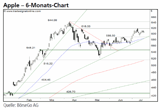 Ausblick: Solange die Aktien von Apple oberhalb der mittelfristigen Aufwärtstrendlinie und zugleich der Unterstützung bei 588,50 USD verbleiben können, besteht aus unserer Sicht die Chance, den Aufwärtstrend der letzten Tage zu einem Anstieg bis und gegebenfalls bereits über das Allzeithoch zu nutzen. Die Long-Szenarien: Bricht der Wert auf Tagesschlusskursbasis über 618,00 USD aus, wäre ein kurzfristiges Kaufsignal aktiv, welches man entsprechend „long“ handeln könnte. In der Folge dürfte es zu einer Kaufwelle bis 644,00 USD kommen. Wird auch das Allzeithoch überwunden, könnte sich der Aufwärtstrend der Aktien bis 680,00 USD fortsetzen. Auf mittlere Sicht hätte der Wert bei einem Ausbruch über 644,00 USD bereits Potential bis 750,00 USD. Die Short-Szenarien: Mit einer leichten Zwischenkorrektur bis 588,50 USD wäre hingegen zu rechnen, sollten die Käufer an der Hürde bei 618,00 USD scheitern. Von dort aus könnte sich der Aufwärtstrend der letzten Tage jedoch fortsetzen. Sollte diese Unterstützung unterschritten werden, würde dem Wert jedoch ein Rückfall in den Seitwärtsmarkt der Vormonate drohen. In diesem Fall könnte es zu einer Korrektur bis 548,21 USD kommen.