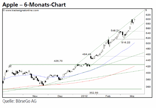 Rückblick: Die Aktien von Apple befinden sich langfristig in einem steilen Aufwärtstrend, der im Sommer des Jahres 2011 in eine leichte Seitwärtskonsolidierung überging.
