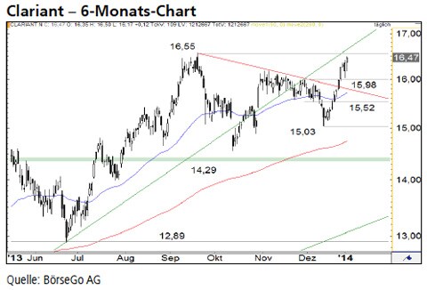 Ausblick: Ausgehend von einem Tief bei 15,03 CHF läuft in den letzten Tagen eine weitere Kaufwelle, die es dem Wert ermöglichen würde, an der Unterseite einer gebrochenen Aufwärtstrendlinie auf neue Hochs anzusteigen. Die Wahrscheinlichkeit für einen Ausbruch über 16,55 CHF ist aufgrund der Dynamik der laufenden Aufwärtsbewegung entsprechend hoch. Die Long-Szenarien: Kurzfristig könnte es jetzt zu einer leichten Korrektur kommen, doch so lange die Aktien von Clariant über der Unterstützung bei 15,98 CHF verbleiben, ist der Aufwärtsimpuls seit Mitte Dezember intakt. Bei einem anschliessenden Ausbruch über die Barriere bei 16,55 CHF könnte der Wert rasch bis 17,45 CHF haussieren. Sollte diese Marke ebenfalls überwunden werden, sind mittelfristig weitere Kurssteigerungen bis 18,50 CHF möglich. Selbst eine vorübergehende Ausweitung der Rally bis 19,50 CHF wäre in diesem Fall denkbar. Die Short-Szenarien: Erst ein deutlicher Kursrutsch unter die angesprochene Haltemarke bei 15,98 CHF würde den Aufwärtsdrang der Käuferseite etwas bremsen. Doch könnte sich der Kaufimpuls bereits ausgehend von der Unterstützung bei 15,52 CHF fortsetzen. Bricht der Wert dagegen auch unter diese Marke ein, wäre der Aufwärtstrend neutralisiert und mit Abgaben bis 15,03 CHF zu rechnen. Kann sich an dieser Stelle kein solider Boden ausbilden, sind weitere Verluste bis an die zentrale Unterstützung bei 14,29 CHF zu erwarten. Dort dürften die Käufer jedoch wieder aktiv werden.