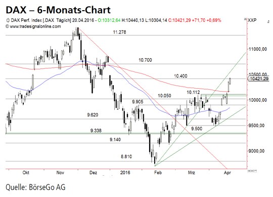 Rückblick: Anfang April stoppten die Bullen eine steile Verkaufswelle, die den DAX Index von einem Verlaufshoch bei 10.112 Punkten bis an die Unterstützung bei 9.500 Punkten gedrückt hatte.
