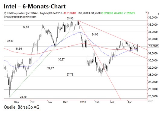 Rückblick: Mit dem Rückfall unter eine mehrwöchige Seitwärtsbewegung zwischen der Hürde bei 35,56 USD und der kurzfristigen Unterstützung bei 34,00 USD endete im Januar dieses Jahres eine mittelfristige Aufwärts-trendphase bei den Aktien von Intel.