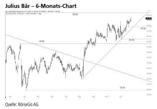 Rückblick: Im November 2016 stiegen die Aktien von Julius Bär über den starken Widerstand bei 44,65 CHF an und vollendeten damit eine mittelfristige Trendwende.