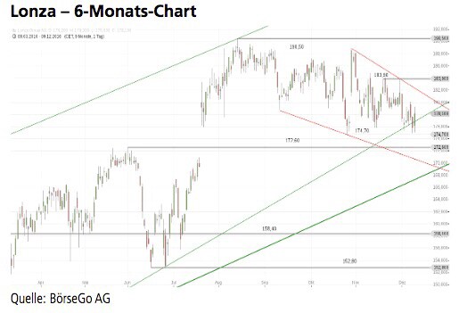 ... erfolgte dieser Anstieg innerhalb eines Trendkanals, bevor an der Trendkanaloberkante bei 190,50 CHF ein Hoch ausgebildet wurde. Seit August dieses Jahres geht es auf hohem Niveau seitwärts voran. Nach einem Rücklauf bis zur 174,70 CHF-Marke konnten die Notierungen Ende Oktober noch einmal stark zulegen, erreichten die 190,50 CHF-Marke aber nicht mehr. Es wurde anschliessend ein Abwärtstrend ausgebildet, welcher auch aktuell noch intakt ist. Darunter bewegten sich die Notierungen zuletzt knapp durch den steileren Aufwärtstrend der Vorjahre nach unten hindurch und erreichten zuletzt die 174,70 CHF-Marke.