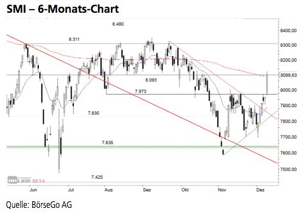 ... bei 7.635 Punkten. Davon ausgehend konnten sich die Notierungen erholen und innerhalb einer symmetrischen Dreiecksformation fangen. Anfang Dezember rutschte der Index aus dem Dreieck nach unten raus, was sich jedoch schnell als Bärenfalle darstellte. In der Folge gelang ein klarer Ausbruch über den bei 7.850 Punkten liegenden Abwärtstrend nach oben.