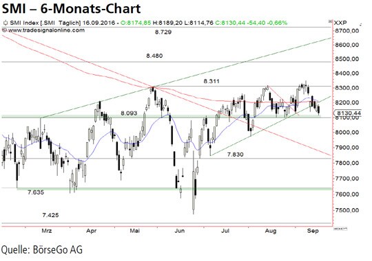 Ausblick: Der Trendbruch kann zunächst bearish bewertet werden und könnte somit bald weitere Abgaben nach sich ziehen. Andererseits befindet sich der Index auch wieder über einer wichtigen Unterstützung, welche die Notierungen erneut nach oben führen könnte. Eine klare Richtungsentscheidung bleibt abzuwarten. Die Long-Szenarien: Ausgehend von der bei 8.093 Punkten liegenden Haltemarke ist eine Reaktion nach oben direkt möglich. Diese könnte zunächst wieder bis zur 8.311 Punkte-Marke führen. Ein klarer Ausbruch über die 8.311 Punkte-Marke würde anschliessend ein neues Kaufsignal aktivieren, welches bis zur 8.480 Punkte-Marke führen kann. Da dann auch eine grosse Bodenbildung abgeschlossen wäre, dürfte eine ausgedehnte Rally in Richtung der 8.729 Punkte-Marke möglich werden. Die Short-Szenarien: Bereits unterhalb der 8.093 Punkte-Marke besteht die Gefahr, ein Doppelhoch zu vollenden. In diesem Fall wäre ein Rückfall bis zur 7.830 Punkte-Marke möglich, mit einem Zwischenziel an der 8.000 Punkte-Marke.