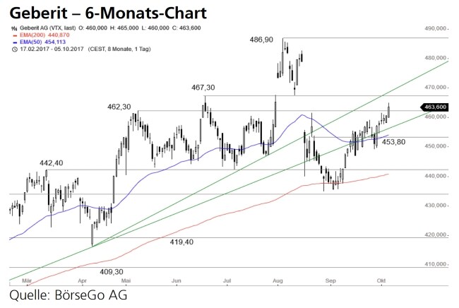 Rückblick: Ende Juli startete eine weitere Kaufwelle bei den Aktien von Geberit, die zunächst zu einem Ausbruch über die Kurshürde bei 467,30 CHF führte und den Wert bis 486,90 CHF katapultierte.