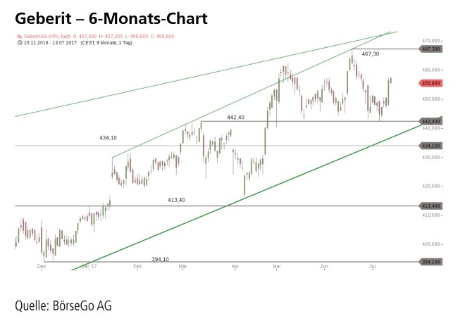 467,30 CHF führen. Wird dieses Niveau nach einem Rücksetzer überwunden, bietet sich Spielraum bis zur Kanaloberkante bei