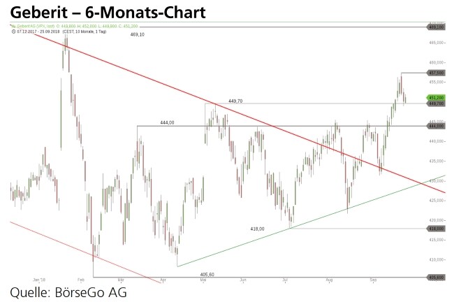 Rückblick: Die Aktien von Geberit erreichten nach einer starken Rallyphase im Juli 2017 ein Hoch bei 486,90 CHF, um sich anschliessend in eine Korrektur zu begeben.