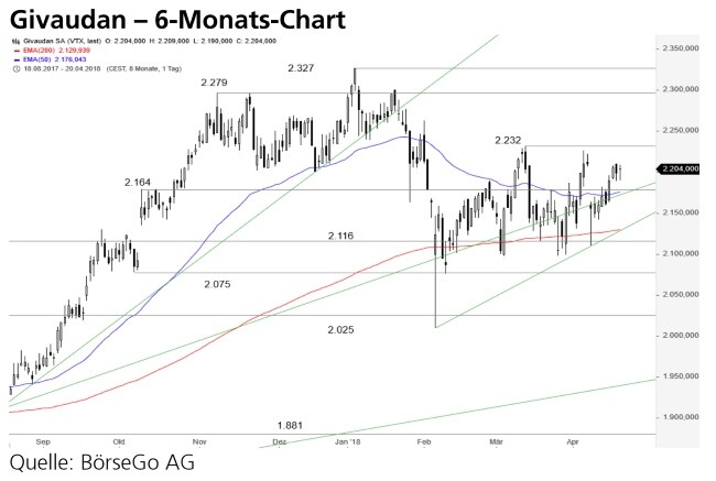 Rückblick: Mit dem Ausbruch über den Widerstand bei 2.279 CHF sprangen die Aktien von Givaudan Anfang Januar dieses Jahres auf ein neues Allzeithoch bei 2.327 CHF.