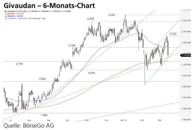 Rückblick: Zu Beginn des vergangenen Jahres gelang es der Käuferseite bei den Aktien von Givaudan im Bereich von 1.700 CHF einen Boden auszubilden und sich in den folgenden Monaten erfolgreich gegen den damals vorherrschenden Abwärtstrend zu stemmen.