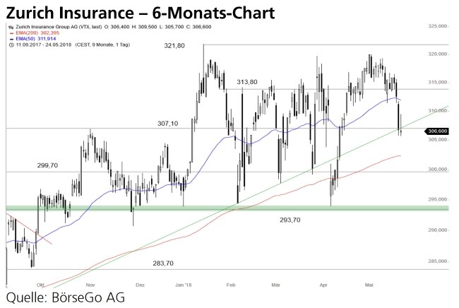 weiterer Angriff auf die Aufwärtstrendlinie auf Höhe von 303,00 CHF verhindert werden. Die Abwärtsdynamik der letzten