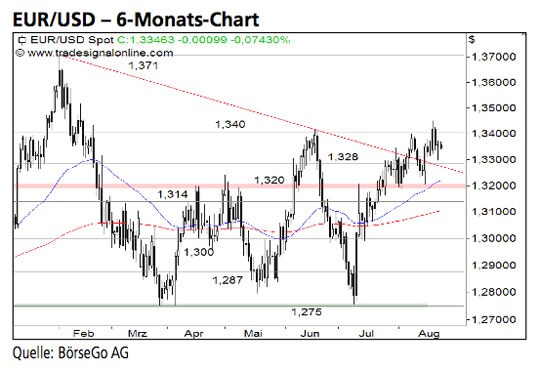 Auch wenn die im Juli gestartete Aufwärtsbewegung bereits weit fortgeschritten ist, bestätigt das neue 6-Monats-Hoch bei 1,345 USD die Rally beim Euro. Die Long-Szenarien: In dieser Woche untermauert EUR/USD den Ausbruch über die seit Februar intakte Abwärtstrendlinie mit einem lehrbuchmässigen Rücklauf. Im besten Fall für die Bullen könnte der Wert damit seine Aufwärtsbewegung direkt fortsetzen. Oberhalb des Widerstands bei 1,340 und des bisherigen Rallyhochs bei 1,345 USD wäre der Weg bis zum Jahreshoch bei 1,371 USD frei. Die Short-Szenarien: Bereits bei 1,328 USD ist EUR/USD gut unterstützt. Die Kreuzunterstützung leitet sich aus dem Schnitt einer Horizontalen und dem überschrittenen Abwärtstrend her. Fällt das Devisenpaar unter 1,328 USD, würde die zentrale Unterstützung bei 1,320 USD in den Fokus rücken. Erst darunter wäre ein Verkaufssignal aktiv, das weitere Verluste bis auf 1,314 und 1,300 USD mit sich bringen dürfte.