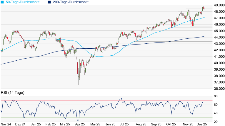 publizierten US-Arbeitsmarktdaten und den am Donnerstag veröffentlichten US-Inflationsdaten abhängen. Kann der Markt mit den Daten leben, könnte es zu einem Jahresendspurt kommen. Fallen diese nicht nach dem Geschmack des Marktes aus, könnten wir die Jahreshöchststände bereits gesehen haben. In diesem Fall könnte die aktuell bei 47.106 Punkten verlaufende 50-Tage-Linie wieder in den Fokus rücken. Zuvor würde sich mit dem Zwischenhoch vom 29. Oktober bei 48.041 Punkten noch eine