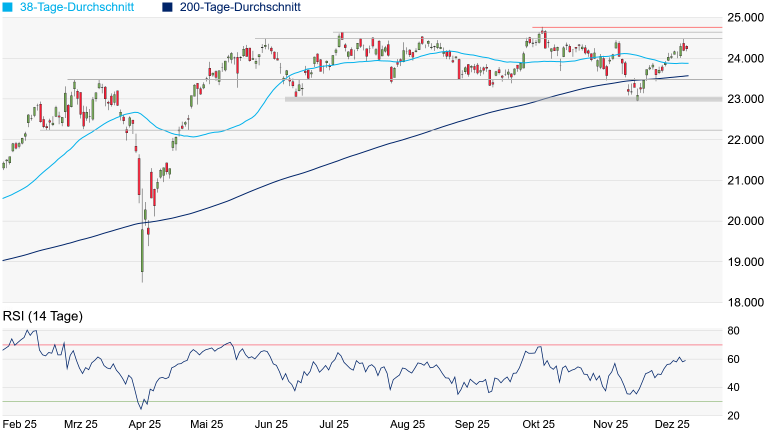 25.000-Punkte-Marke erscheint bis zum Jahresende somit noch immer möglich. Bleiben die Anleger hingegen skeptisch, dürften die beiden gleitenden Durchschnitte der vergangenen 38 Tage bei 23.877 Punkten respektive 200 Tage bei 23.571 Punkten wieder angesteuert werden. Gravierend eintrüben würde sich das Chartbild dann bei einem Unterschreiten des Doppeltops vom März bei 23.476 Punkten.