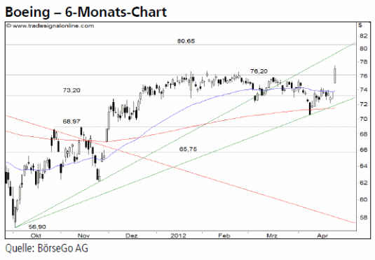 Ausblick: Die gestrige Kaufwelle bedeutet nicht nur das Ende der mittlerweile drei Monate andauernden Korrekturphase. Sie könnte nun zum Ausgangspunkt einer Fortsetzung des Aufwärtstrends seit August 2011 werden. Die Long-Szenarien: Oberhalb von 76,20 USD dürften die Aktien an der Unterseite der im März unterschrittenen Aufwärtstrendlinie bis 80,65 USD ansteigen. Entsprechend könnte man den gestrigen Ausbruch über 76,20 USD „long“ handeln. Diese Position könnte man mit einem Stoploss knapp unterhalb von 74,00 USD absichern. Sollte im weiteren Verlauf auch die 80,65 USD-Marke überwunden werden, würde dies ein weiteres Kaufsignal mit Zielen bei 82,50 und 88,29 USD auslösen. Die Short-Szenarien: Ein vorheriger Rückgang in den Bereich um 74,00 USD wäre aus unserer Sicht für den weiterhin bullishen Ausblick unbedenklich. Erst unterhalb dieser Marke wäre der gestrige Kurssprung in Frage zu stellen und eine Korrektur bis 72,17 USD und darunter auf 70,60 USD wahrscheinlich. Allerdings könnten die Aktien bereits von dort zu einem erneuten Höhenflug ansetzen. Denn erst bei Kursen unter 68,97 USD wäre der Aufwärtstrend unterbrochen und ein Ausverkauf bis 62,00 USD die mögliche Folge.