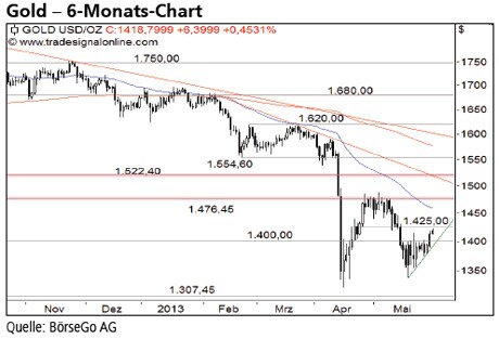 Rückblick: Im Rahmen einer massiven Verkaufswelle durchbrach der Goldpreis Mitte April die langfristig entscheidende Unterstützung bei 1.522,40 USD und fiel bis auf 1.321,22 USD zurück.