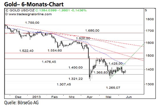 Das in der KeyInvest Daily Markets Analyse vom 31.05. beschriebene Short-Szenario ist mit dem Fall aus dem Dreieck aktiviert. Nach Aufgabe der Unterstützung bei 1.380,00 USD sind weitere Verluste bei dem Wert einzukalkulieren.Die Short-Szenarien: Bricht der Goldpreis in den kommenden Tagen unter das bisherige Wochentief bei 1.365,63 USD ein, dürfte sich der Abwärtsdruck verschärfen und ein Test des Apriltiefs bei 1.321,22 USD rückt näher. Weitere Unterstützungen liegen im Chart bei 1.307,45 und 1.265,07 USD. Unterhalb von 1,265,07 USD wird das Erreichen der runden 1.000,00 USD-Marke wahrscheinlich. Die Long-Szenarien: Erst bei einem Anstieg über den Widerstand bei 1.425,00 USD würde sich die Lage beim Goldpreis etwas entspannen. Um das Chartbild nachhaltig aufzubessern, müsste allerdings der Widerstand bei 1.476,45 USD überwunden werden. Davon sind die Bullen aktuell weit entfernt.