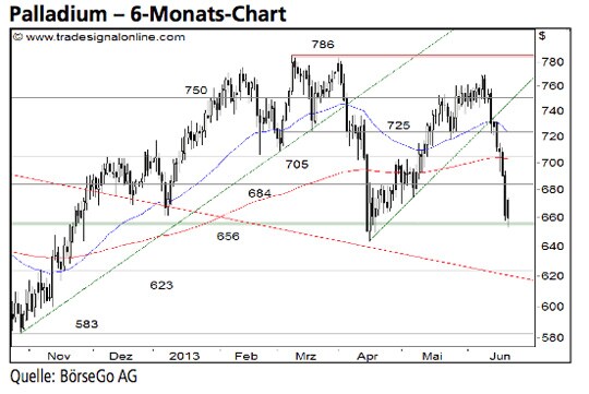 Die Bären haben mit dem Ausverkauf der letzen Wochen die gesamte Aufwärtsbewegung seit April neutralisiert. Aktuell droht der Wert sogar unter das Tief des April einzubrechen. Die Short-Szenarien: Sollte die aktuelle Schwäche bei Palladium anhalten und der Wert unter der 684,00 USD-Marke verbleiben, sind weitere Verluste bis 656,00 USD zu erwarten. Bleibt dort eine Stabilisierung aus, wäre bei einem Bruch der Unterstützung ein mittelfristiges Verkaufssignal aktiv. In der Folge würde ein Ausverkauf bis 623,00 USD zurückführen. Bei anhaltendem Abgabedruck könnte es mittelfristig zu einem weiteren Kurseinbruch bis 583,00 USD kommen, ehe dort mit einer Bodenbildung zu rechnen wäre. Die Long-Szenarien: Sollte der Wert dagegen die 684,00 USD- Marke zurückerobern, dürfte eine leichte Erholung einsetzen, die jedoch bereits bei 705,00 USD enden könnte. Würde diese Barriere dagegen im weiteren Verlauf überwunden, könnte sich die Gegenbewegung bis 725,00 USD fortsetzen. Allerdings wäre nach unserer Einschätzung erst ein nachhaltiger Ausbruch über diese Hürde bullish zu werten, der eine Aufwärtsbewegung bis zur 750,00 USD-Marke auslösen würde.